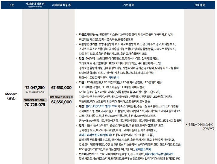 모던보다 한단계 상위 모델인 프리미엄의 가격은 세전 약 7,500만원이며, 세금 혜택을 적용하면, 약 7,095만원 입니다.