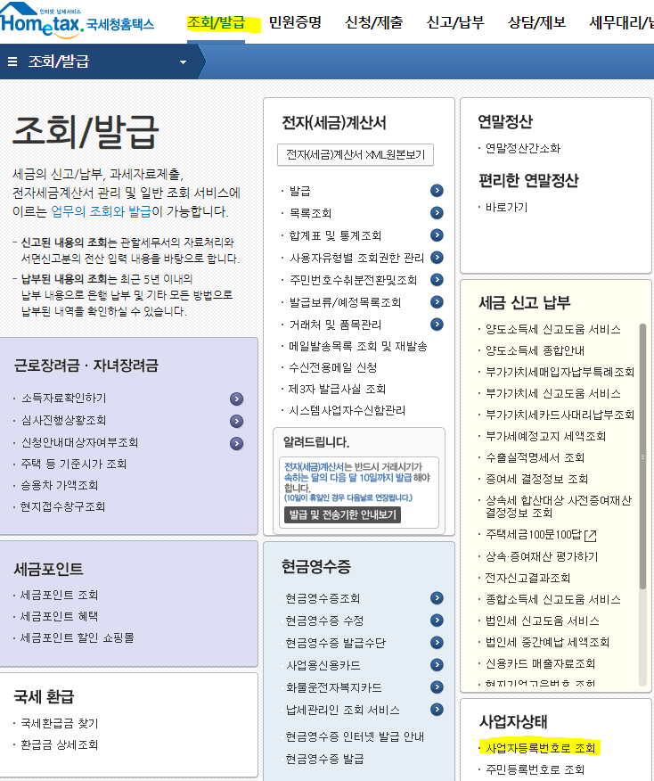 조회/발급을 클릭합니다. 화면 하단부에 사업자상태라는 카테고리가 있고, 그 아래에 사업자등록번호로 조회 라는 메뉴가 있습니다. 사업자등록번호 조회를 클릭합니다.