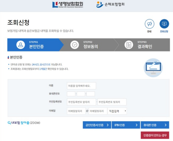 내 보험 찾아줌 홈페이지에서 조회하기