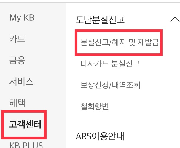 2. 카드분실신고 메뉴로 들어가서, 분실신고, 해지 및 재발급을 선택합니다.
