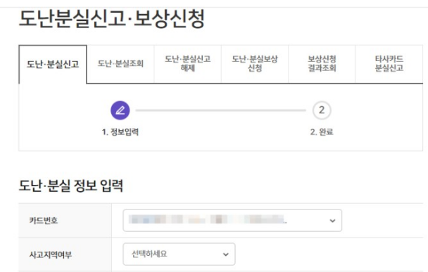 2. 카드번호 및 사고지역, 재발급 여부를 선택하고, 기타 정보들을 입력합니다.