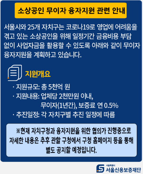 서울신용보증재단의 지원내용은 업체단 2천만원이내, 1년간 무이자, 보증료는 연0.5% 입니다. 긴급자영업자금, 재해중소기업 자금, 코로나19 피해기업자금 등 대출을 받을 수 있는 자금 지원의 종류가 다양하기 때문에, 상담 후 지원 받을 수 있는 프로그램으로 신청을 해야 합니다.