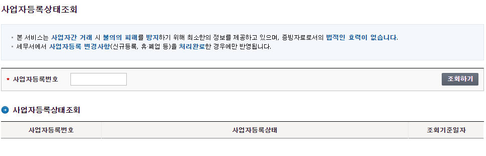 사업자등록상태조회 화면이 표시되고, 사업자등록번호 입력칸이 보입니다.