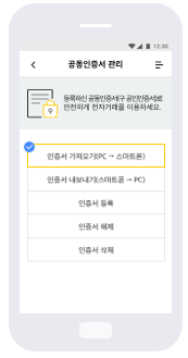 8. 앱에서 고색센터 메뉴에 들어가서, 공동인증서 관리를 클릭합니다.