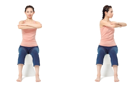 3. 숨을 내쉬면서, 상반신만 오른쪽으로 최대한 비틀고 5초간 유지합니다.