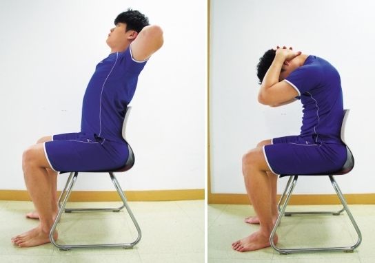 1. 의자에 앉아서 손에 깍지를 끼고, 머리 뒤로 얹습니다.