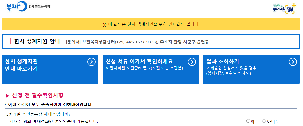 복지로 홈페이지에서 한시 생계지원금 신청하기