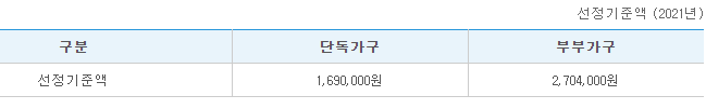 선정기준액은 2021년 기준으로 단독가구는 1백69만이고, 부부가구는 2백7십만4천원입니다.
